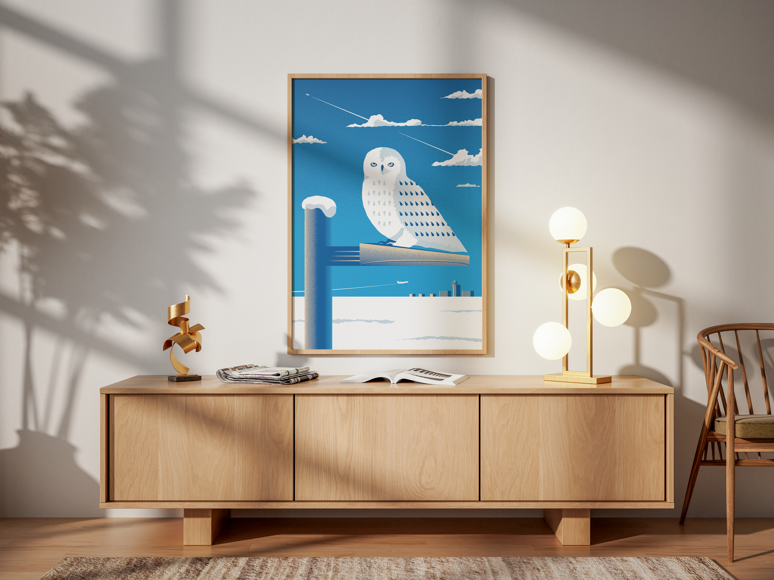 My 2024 poster was inspired by my family’s tradition of bundling up and braving the harsh Minnesota winter in search of snowy owls in the fields around MSP. On cold days, we gather at the outdoor aircraft viewing area, hoping to catch a glimpse of these majestic birds as they burrow into the fields—or, in this case, perch atop a lamp. Bundled against the elements, we watch as their cloud-white feathers contrast beautifully with the bright blue skies, shared with their “other” frequent flyers.